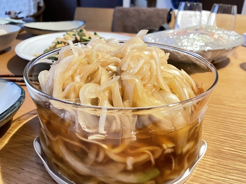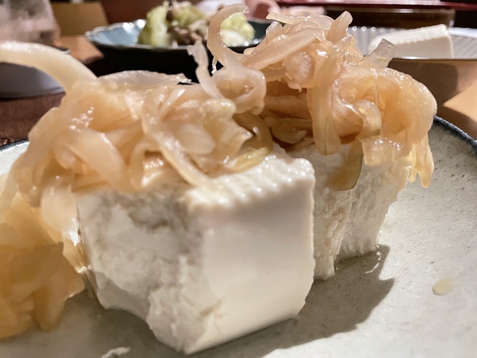 その玉ねぎのしょうゆ漬けをそのままでもよいし、薬味として豆腐の上に乗せていただくなど。